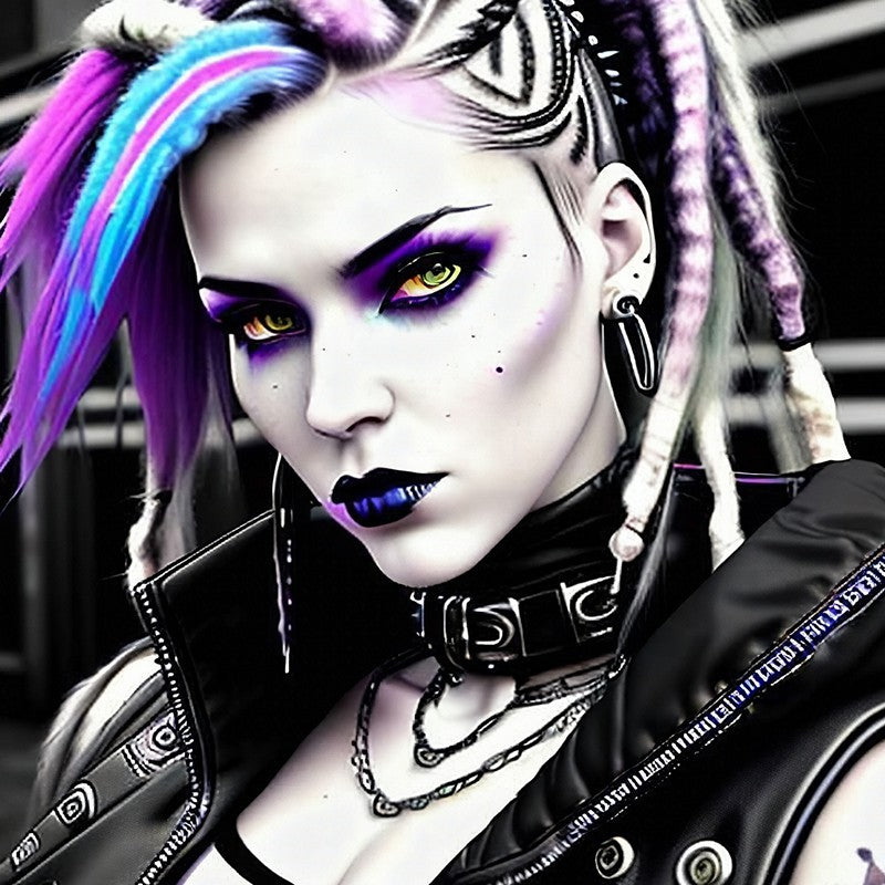 Ignite your space with the bold and electric energy of Neon Rebellion, a framed print that captures a striking cyberpunk and futuristic goth aesthetic. This intense portrait draws you in with the subject’s serious, direct gaze and vibrant, multi-colored hair, styled into thin dreadlocks and bright bangs in shades of purple, blue, and pink.