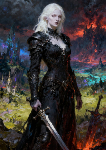 The Weapon of Rule: She holds a large, finely detailed sword with a broad, polished blade, resting it with a firm grip in front of her. Near her feet, a large rusted sword is driven into the ground beside a glowing red source, symbolizing the fiery reign of iron and ruin.