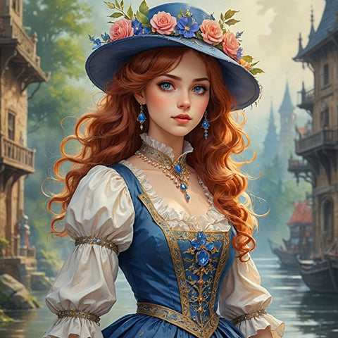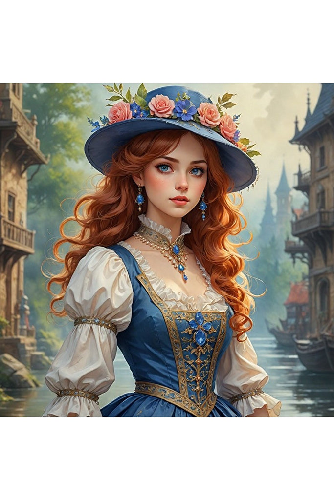 Invite the charm and picturesque detail of an old-world setting into your home with the Royal Blue and Auburn framed print from Oakhart Industries. This beautiful digital portrait combines romantic historical elements with fantasy elegance, capturing a sunlit moment in a European canal city. It’s an ideal piece for those who appreciate vivid colour, detailed attire, and an enchanted, refined aesthetic.