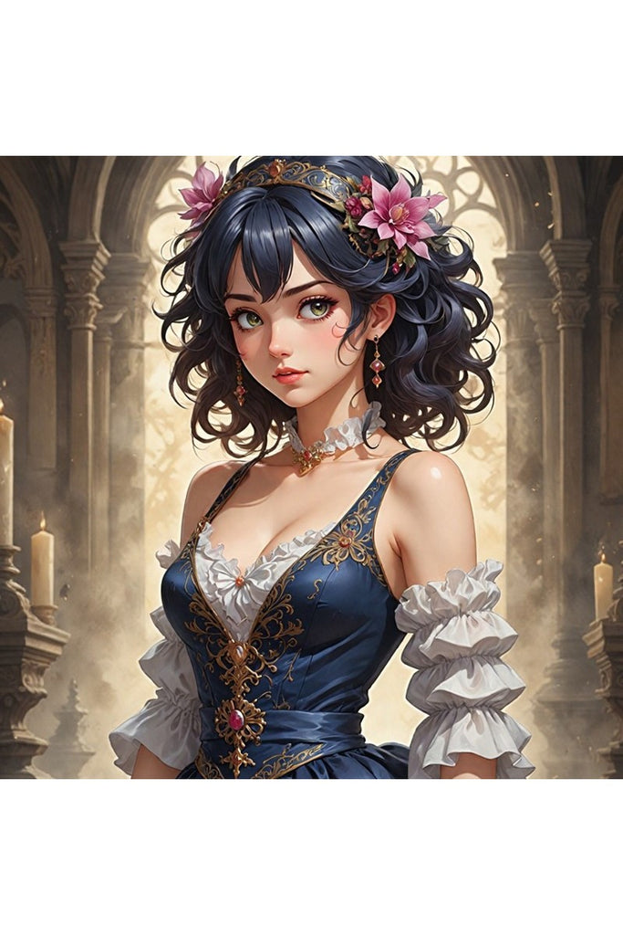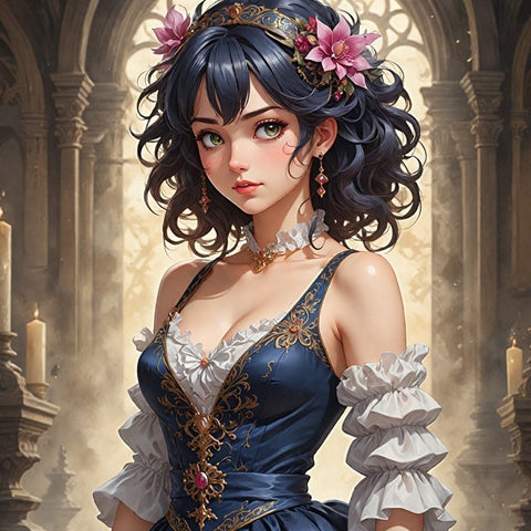 The Ruby Focus: Her deep navy blue dress is the perfect backdrop for the magnificent ruby-red central gemstone that dominates the bodice. The dress features thin straps, a white ruffled bodice, and intricate gold filigree decoration, emphasizing her royal or noble status.