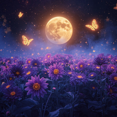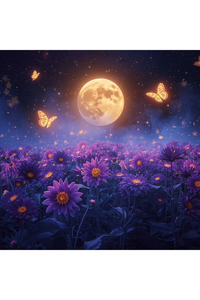 Immerse yourself in a dreamlike nocturnal landscape with The Butterfly Moon Framed Print, an enchanting masterpiece from Oakhart Industries. This captivating artwork transports you to a vibrant field of purple flowers, possibly dahlias, blooming in glorious shades of violet and indigo under a mystical night sky.