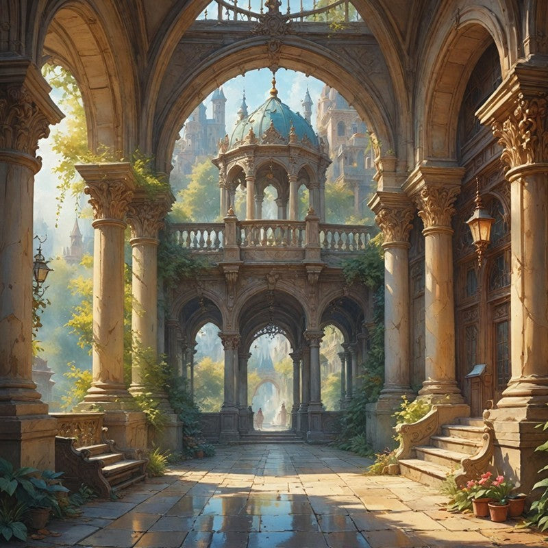 At the heart of the image stands a two-tiered structure with a grand balcony and a striking central gazebo topped with a turquoise dome. Through the archways, your gaze is led to a distant castle and a lush, green landscape, hinting at the vast, beautiful kingdom that lies beyond. This art piece is not just a decoration; it's a window into a peaceful and fantastical realm, perfect for those who appreciate the timeless beauty of fantasy architecture.