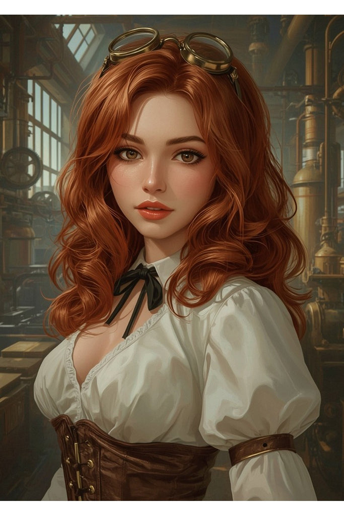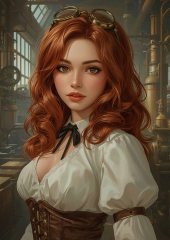 Step into a world of invention and romance with The Machinist's Daughter Print, a unique framed portrait from Oakhart Industries. This artwork beautifully merges classical beauty with the intricate details of steampunk. The central figure is a young woman with a striking presence, her fiery, coppery-red hair flowing in voluminous waves. A pair of classic steampunk goggles rests upon her head, a nod to her industrial surroundings.