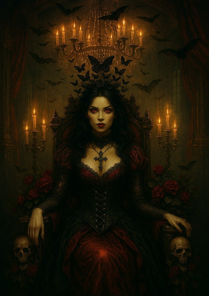 Her attire is an intricate gothic gown with a dramatic red skirt and a black, laced bodice, a large cross pendant hanging from her neck as a symbol of contrast and power. The throne is dramatically flanked by skulls and deep red roses, a powerful juxtaposition of death and beauty. The setting is a grand, dark chamber with heavy red curtains, and the ceiling is illuminated by a burning chandelier. A swirl of bats and butterflies around her head adds to the dark, supernatural theme, creating a truly mesmerizing visual narrative.