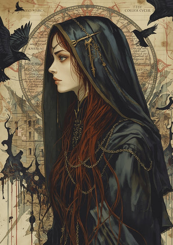 Immerse yourself in the enigmatic beauty of the Whispers of the Old World Print, a distinguished framed artwork from Oakhart Industries. This captivating piece draws you into a realm of profound mystery and ancient tales. The central figure, a striking woman with cascading, vibrant red hair, is partially veiled by a dark, flowing hood. Her solemn expression and focused gaze evoke a sense of deep contemplation, hinting at secrets untold.