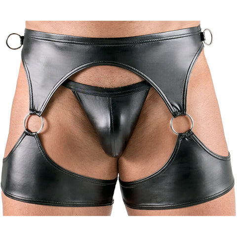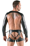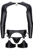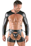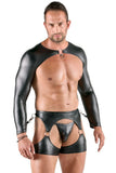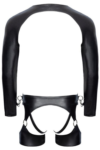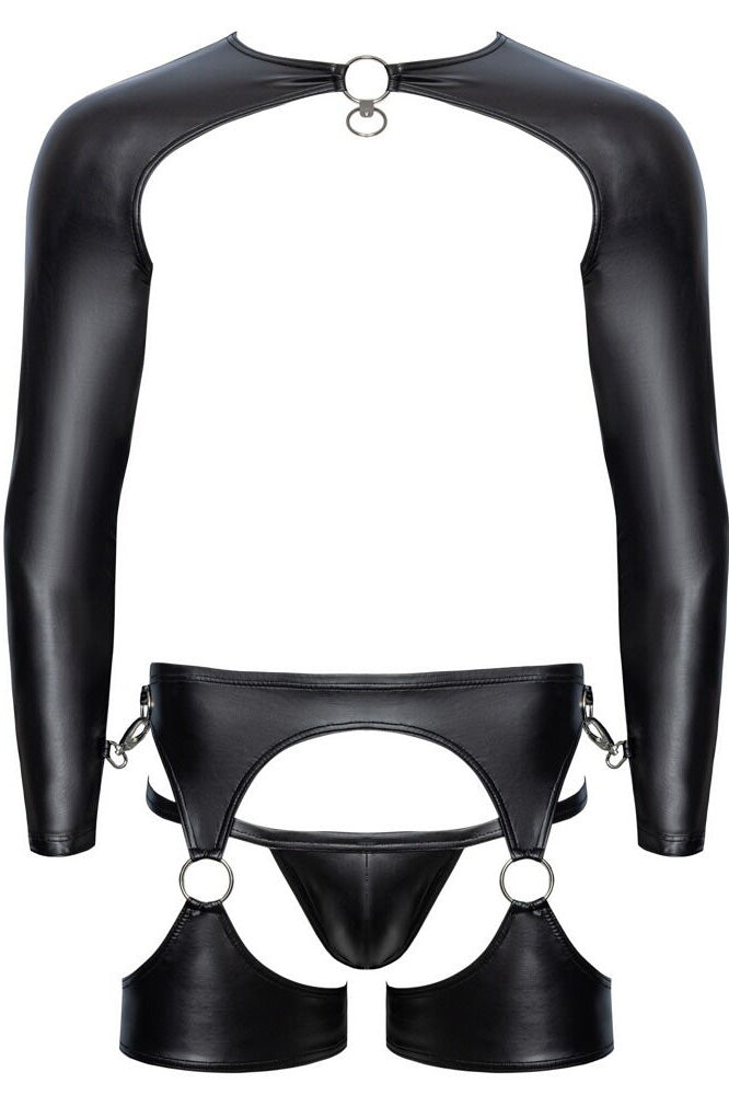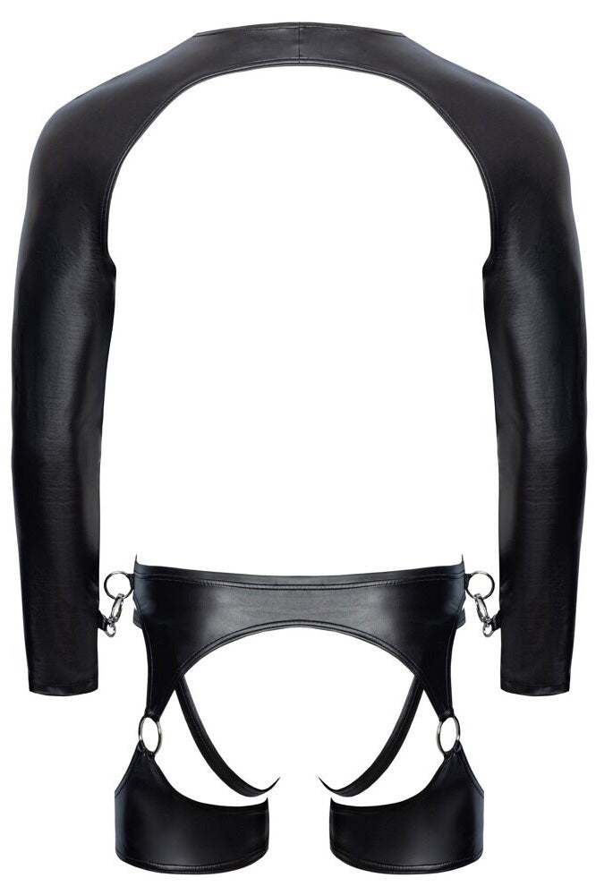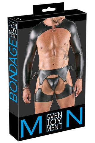 Captivating matte look material! The 3-piece set from Svenjoyment Bondage contains a bolero, hip harness and jock. Everything is made out of trendy black matte look material, which is soft and stretchy for a comfortable fit. With lots of silver-coloured rings and snap hooks on the sleeves for various soft bondage fun.
