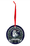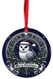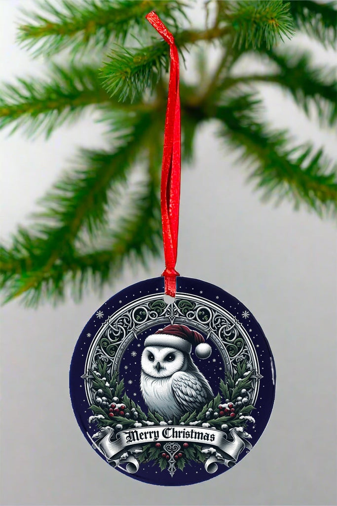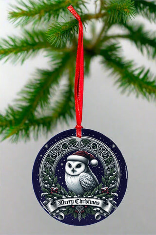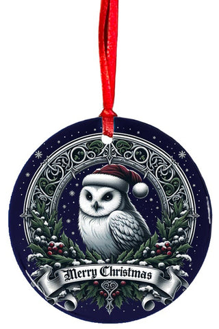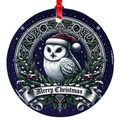 This double-sided ceramic ornament features a charming white gothic owl perched gracefully on a classic Christmas wreath. Topped with a festive Santa hat, the owl offers a delightful contradiction that is both humorous and enchanting. The words "Merry Christmas" are displayed below, adding a traditional holiday message to the whimsical design. The image is printed on both sides, ensuring its delightful detail is visible from every angle on your tree.