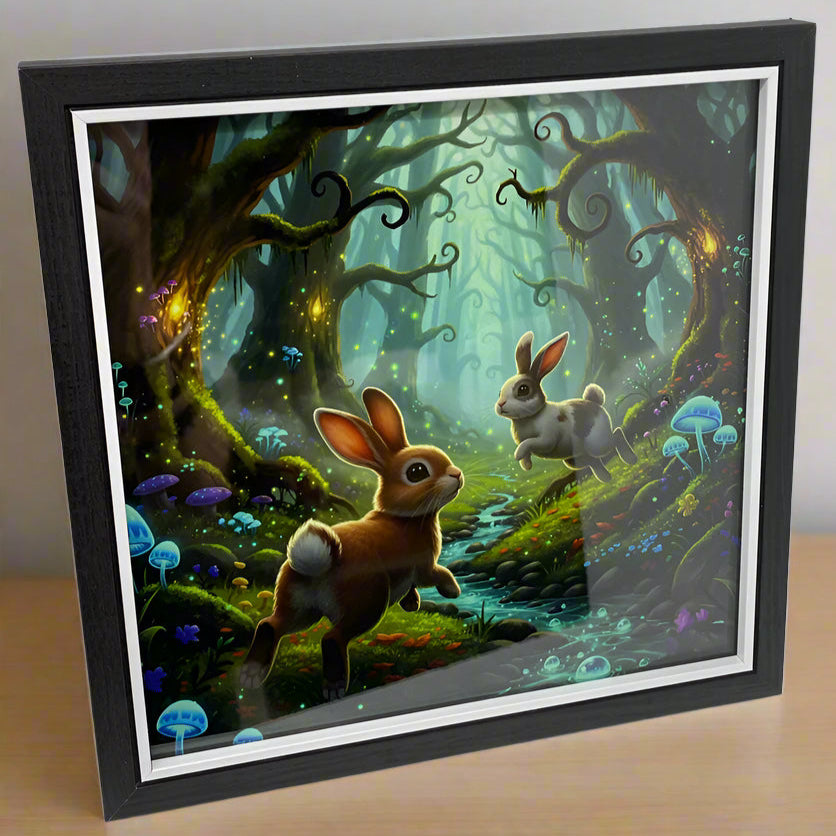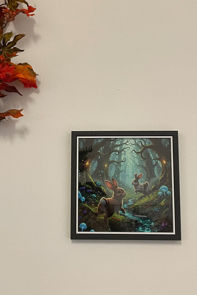 Crafted with exceptional quality, this print depicts two rabbits frolicking in a mystical forest, surrounded by enchanting details like glowing blue mushrooms and a delicate small brook. A touch of fairy dust seems to shimmer across the scene, creating a sense of wonder and joy that is simply breathtaking. The high-definition image is printed directly onto a 20cm x 20cm square aluminium plate, ensuring a unique depth and luminosity that will not fade over time.
