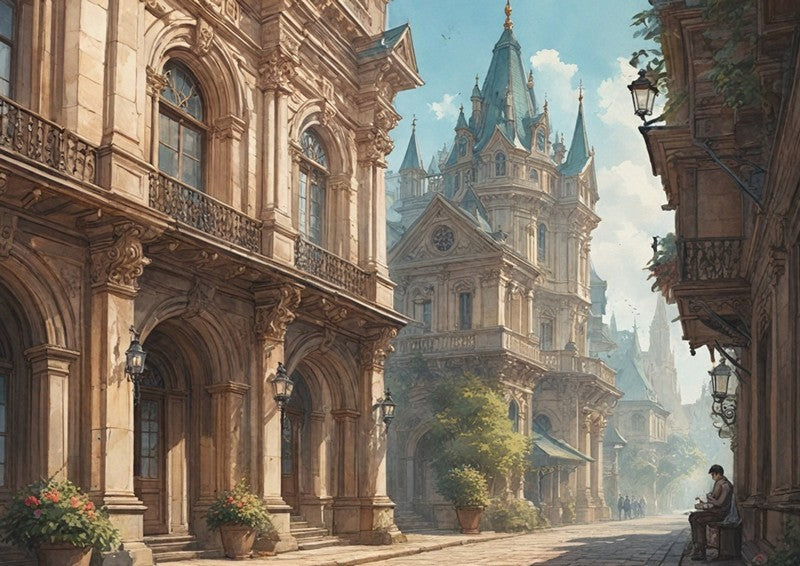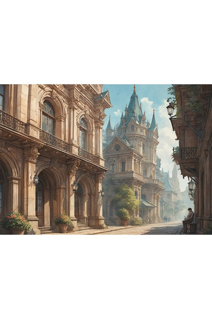 Bring a sense of timeless tranquility to your space with our "A Quiet Afternoon" framed print, a beautifully detailed piece that captures the serene elegance of a European-style street. This art transports you to a peaceful, cobblestone lane lined with grand, ornate buildings and elaborate facades. The artist's expertise is showcased in the intricate details, from the arched entryways to the decorated balconies, which evoke a feeling of historical charm.