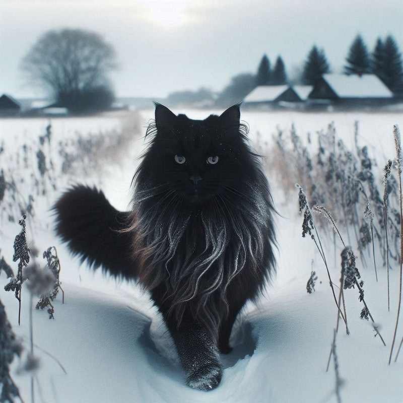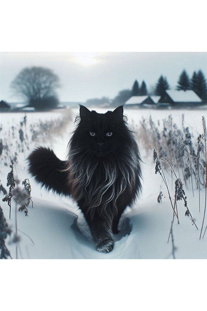In a world blanketed by snow, a long-haired black cat with a coat dusted in frost forges its own path. This image captures more than just a beautiful animal in a stunning setting; it tells a story of quiet strength and serene exploration. With eyes that mirror the soft, muted winter light, the cat's presence brings a sense of warmth and life to the cold, tranquil landscape.