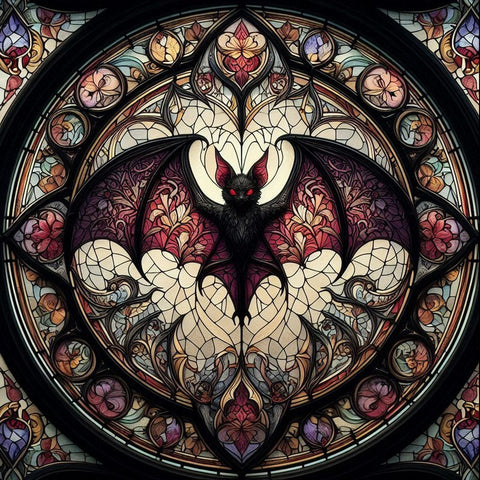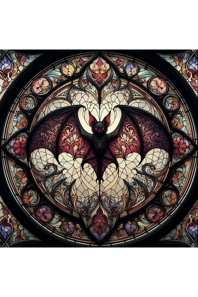 This art print transforms a traditionally feared creature into a stunning work of elegance and majesty. Created in the style of a stained glass rose window, the Bat in the Cathedral Print is a striking square design that centers on a dramatic bat with its wings spread wide, rendered in intricate detail.