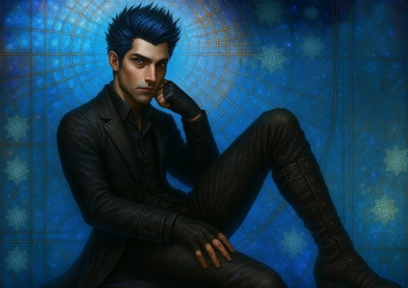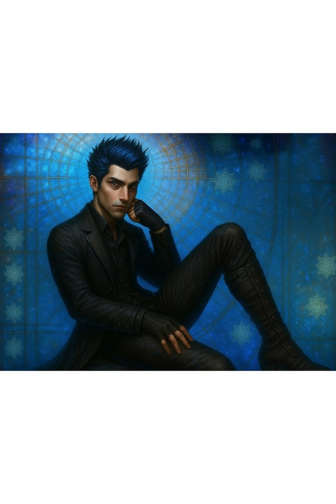 Bring the cosmos to your walls with our "Celestial Requiem" framed print, a captivating piece that merges modern gothic style with a breathtaking celestial backdrop. This stunning portrait features a subject in a contemplative pose, their intense gaze drawing you into the artwork. The artist's expertise is evident in the striking contrast between the subject’s sleek, all-black attire and spiky dark blue hair against a vibrant tapestry of cosmic patterns.