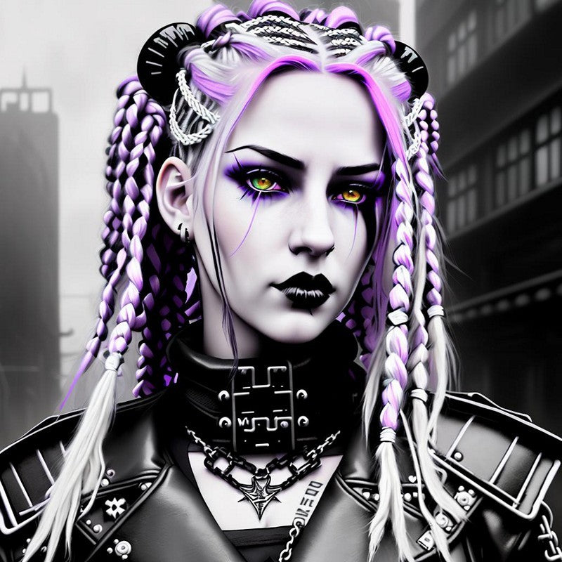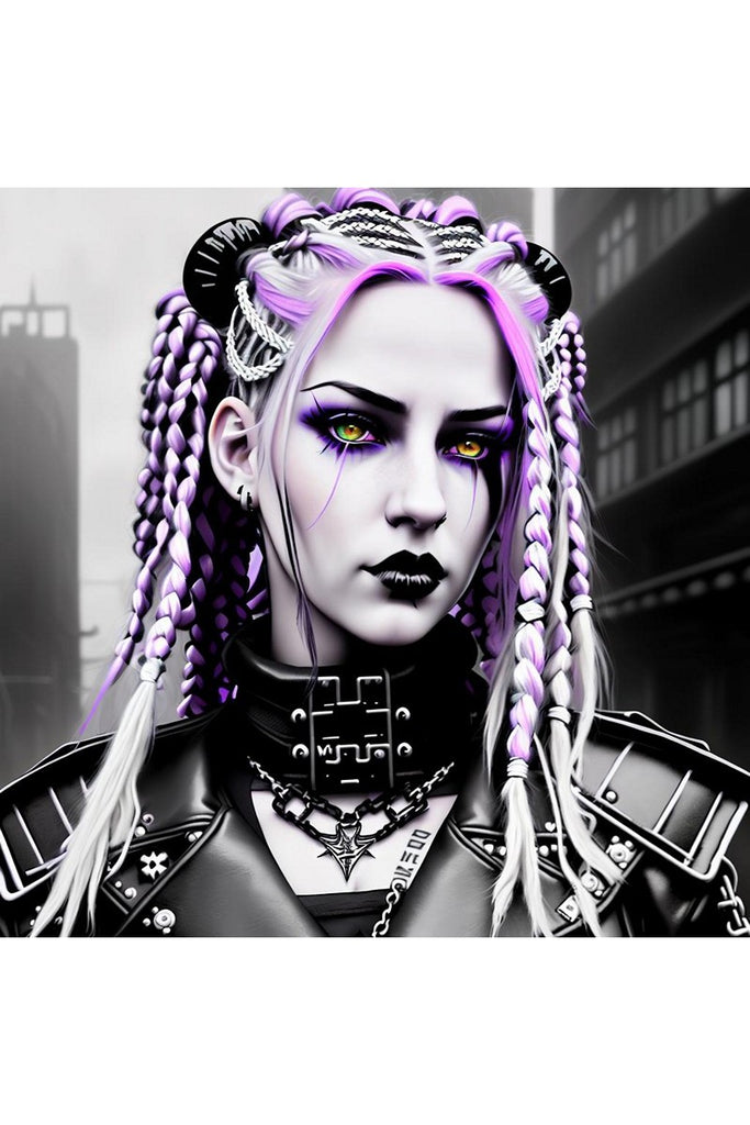 Her hairstyle is a work of art, with intricate braids and twists in shades of white and lavender, adorned with silver chains and hair rings. Two bold, horn-like buns sit atop her head, adding to her unique style. She is dressed in a black leather outfit, complete with silver studs and a bold, geometric choker. The blurred, monochromatic cityscape in the background complements her dark and futuristic aesthetic, making this print a bold statement piece for any collection.