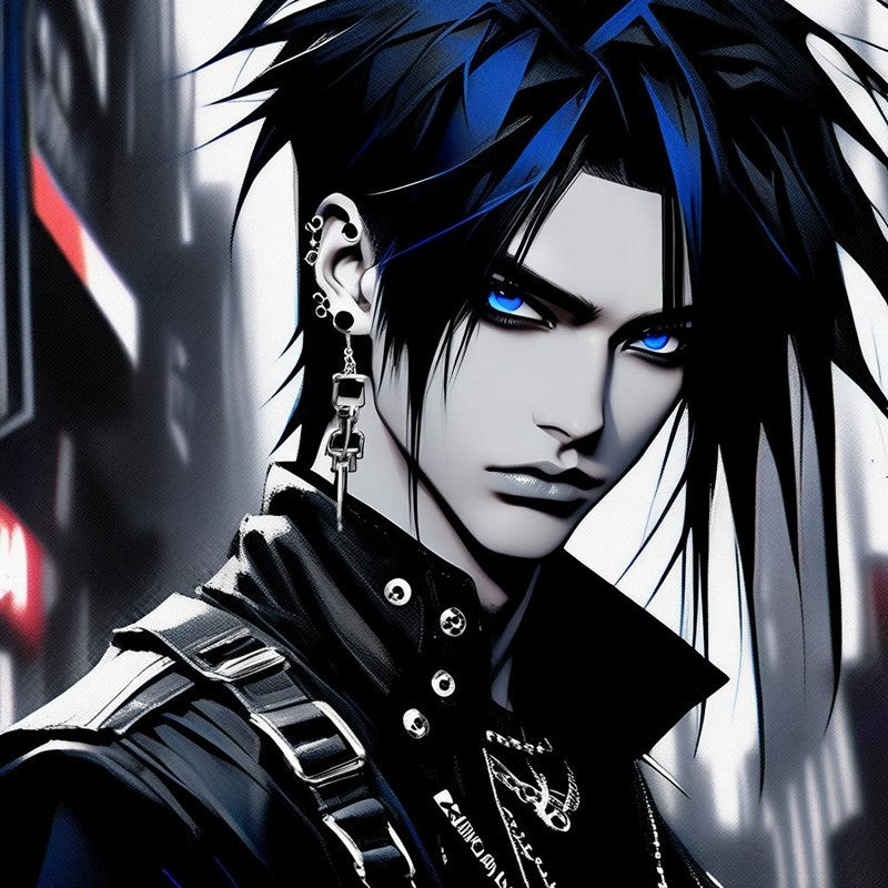 His dark blue and black hair is styled in a dynamic, spiky fashion, with longer strands gracefully framing his face. Dressed in a dark, tactical-style jacket adorned with straps and silver buckles, a popped collar, and an array of chains and a cross necklace, he embodies a fusion of cyberpunk and gothic aesthetics. Multiple earrings, including a distinctive dangling piece, complete his rebellious look. The blurred, monochromatic cityscape background, subtly accented with hints of red, further intensifies the captivating blue of his eyes and hair, creating a dark, confident, and unforgettable mood.