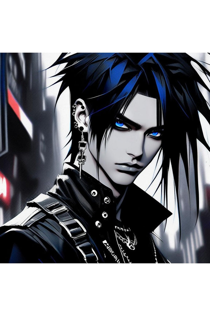 Immerse yourself in the edgy allure of the Oakhart Industries Cool Blue Framed Print. This striking digital portrait, rendered in a captivating anime/manga style, features a young man with an unmistakable presence. His pale, almost greyish skin is dramatically contrasted by his most mesmerizing feature: vibrant, electric blue eyes that pierce with intense focus.