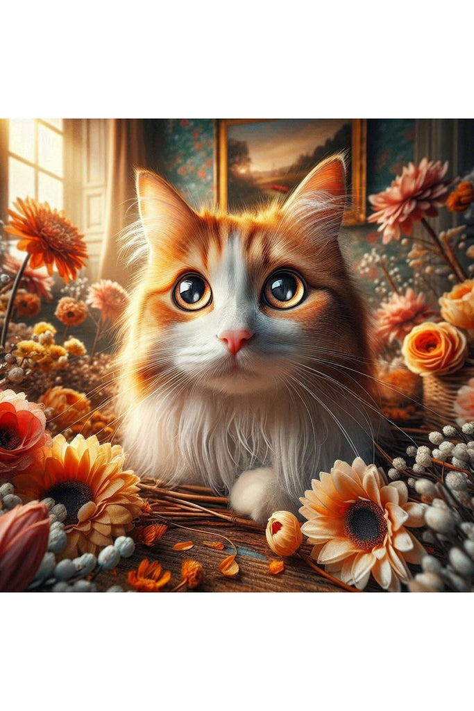 Introducing the Cozy Companion, a celebration of warmth, comfort, and the undeniable sweetness of our feline friends. Inspired by the endearing charm of a fluffy orange and white cat with large, expressive eyes, nestled among a vibrant array of peach, orange, and white blossoms. This picture evoke the cozy, rustic comfort of a sun-drenched indoor space, bringing a touch of gentle warmth and undeniable cuteness into your home.