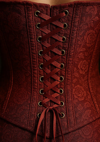 This Oakhart Industries art print, "Crimson Ties," offers an intimate, close-up look at the intricate details of gothic fashion. The piece focuses entirely on the back of a deep red corset, capturing its rich texture and elegant lacing. The fabric itself is a work of art, featuring a subtle, raised floral pattern that gives the print a luxurious, tactile quality.