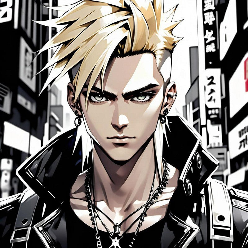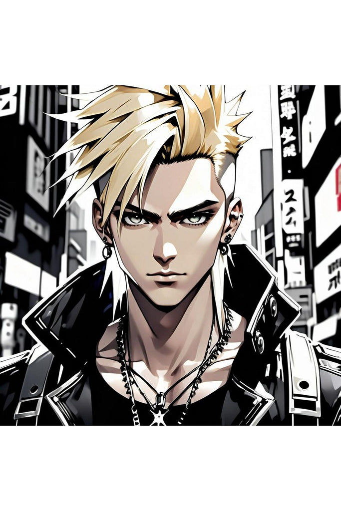 He is captured in an edgy ensemble, featuring a black leather jacket and multiple necklaces, including a distinctive star or cross pendant. In the blurred, monochromatic backdrop, a bustling cityscape hints at a vibrant Japanese street scene. This print is a testament to individuality and urban rebellion, a perfect piece for anyone who appreciates the clean lines and dynamic energy of high-quality digital art.