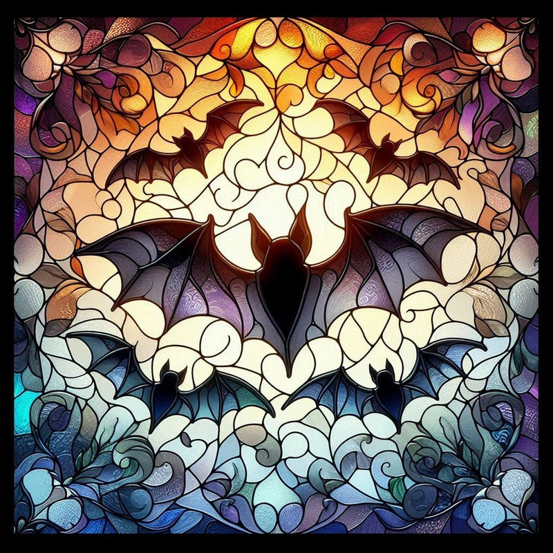 This square art print is a visually striking piece in the style of stained glass, notable for its dramatic contrast of warm and cool colors. The Fire and Ice Bats Print features a swirling scene of bats in flight against a gradient background.