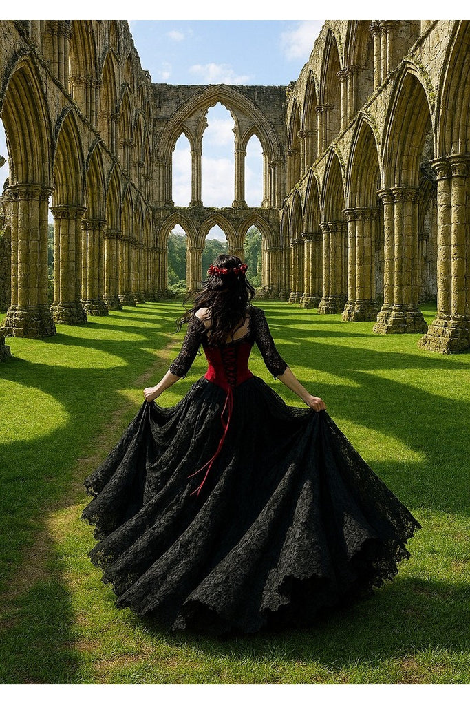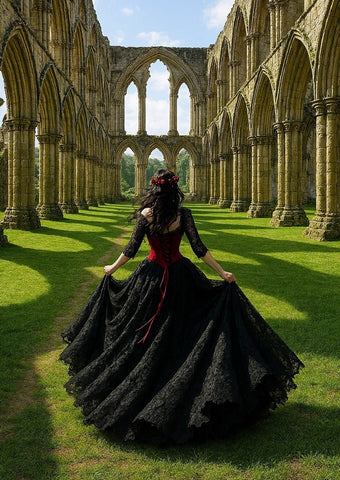 Step into a world of dramatic romance and forgotten beauty with this captivating art print from Oakhart Industries. The piece, titled "Lost in History," presents a stunning gothic lady, seen from behind, her silhouette framed by the majestic ruins of an ancient stone abbey. She is captured mid-walk, holding up her voluminous, layered black lace skirt as it billows gracefully behind her. A striking red and black corset adds a pop of color, while a delicate crown of red flowers adorns her long, dark, wavy hair.