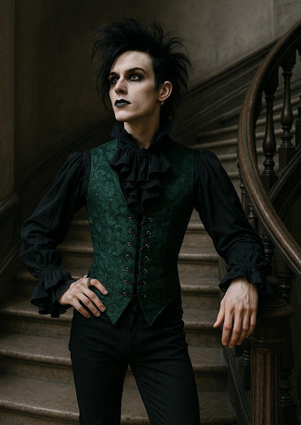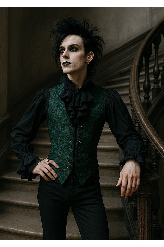 Step into a world of gothic elegance with the Lost In Thought Print. This full-length photographic-style piece captures a person with a gothic-style appearance in a moment of quiet contemplation on a winding wooden staircase. Leaning casually on a handrail and looking away from the camera, they are dressed in a black ruffled shirt, a dark green brocade corset waistcoat, and black trousers.