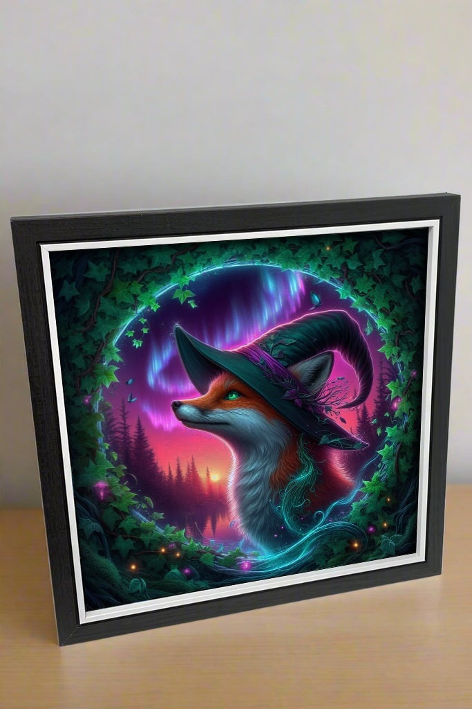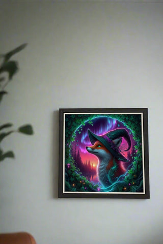 Step into a world of enchanting wonder with the Oakhart Industries Metallic Mystic Fox Picture. This isn't merely an image; it’s a portal to a mystical realm where a charming red fox, crowned with a whimsical witch’s hat, peers from a lush pine forest. The scene is illuminated by an ethereal purple and orange sky, alive with the mesmerizing dance of aurora borealis lights, all gracefully framed by intricate ivy. This artwork perfectly captures the spirit of a fabled forest, infusing any space with a sense of fantasy and charm.