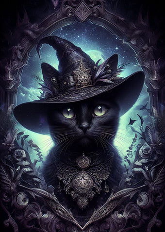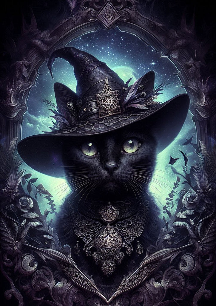 The cat is dressed in an elaborate witch's hat with a wide brim, decorated with magical emblems, feathers, and what looks like a compass or star symbol. Around its neck, the cat wears a detailed, dark medallion and collar with intricate, swirling patterns. The background is a cosmic scene of a starry, teal-and-blue night sky with a faint glow, and a few small, dark flying creatures can be seen in the distance. The overall mood is one of enchantment and mystery.