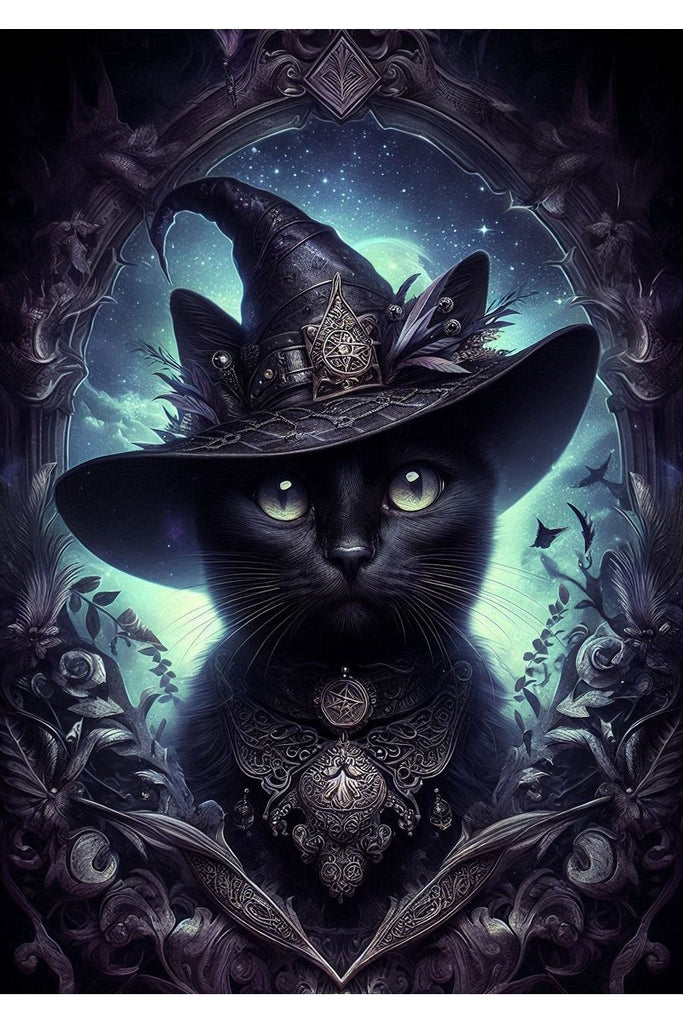 This art print captures a beautiful black cat in a mystical and fantasy style. The Mystic Midnight Print features a cat with bright, mesmerizing green-yellow eyes and a soft, dark coat, framed within an ornate, gothic-style border that gives the impression of a magical mirror or portal.
