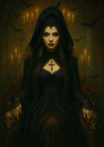 What makes this print so compelling is the profound atmosphere it creates. The subject's pale face and deep red lipstick contrast with her haunting, glowing crimson eyes, which stare directly and intensely at the viewer. The subtle details, such as the skull-adorned throne and the silhouetted bats in the background, add layers of gothic artistry that speak to a refined taste. "Queen of Shadows" is more than just a picture; it’s an immersive visual experience that elevates any room. Each print is professionally framed and ready to hang, ensuring a high-quality, lasting addition to your collection.