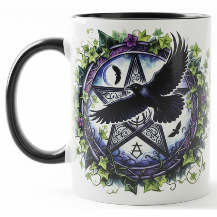 A raven flying against a backdrop of a pentagram set against the night sky.