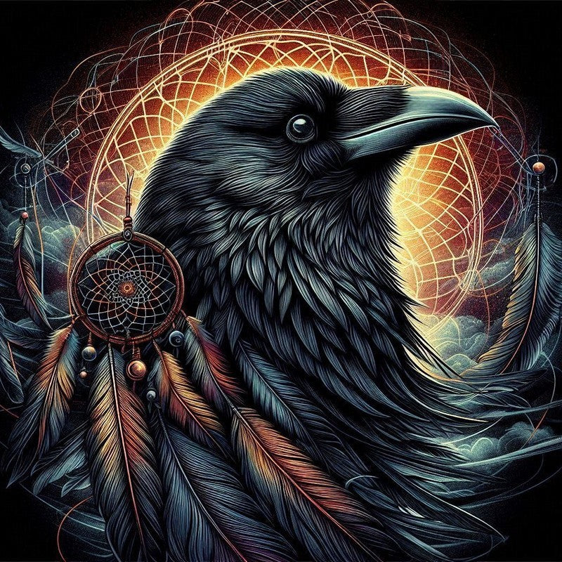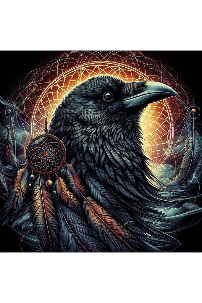 Behind the raven's head is a glowing, sun-like orb from which rays of light extend. Superimposed on the background are two detailed dreamcatchers adorned with beads and feathers, one of which is prominently displayed on the left, with colorful feathers that match the bird's plumage. The overall color palette is dark, with a beautiful contrast between the deep blues and blacks of the raven and the bright oranges and yellows of the glowing elements. This print is a unique blend of nature and indigenous-inspired motifs, a mesmerizing piece that captures the imagination.