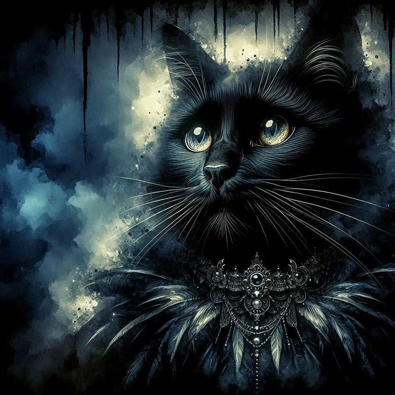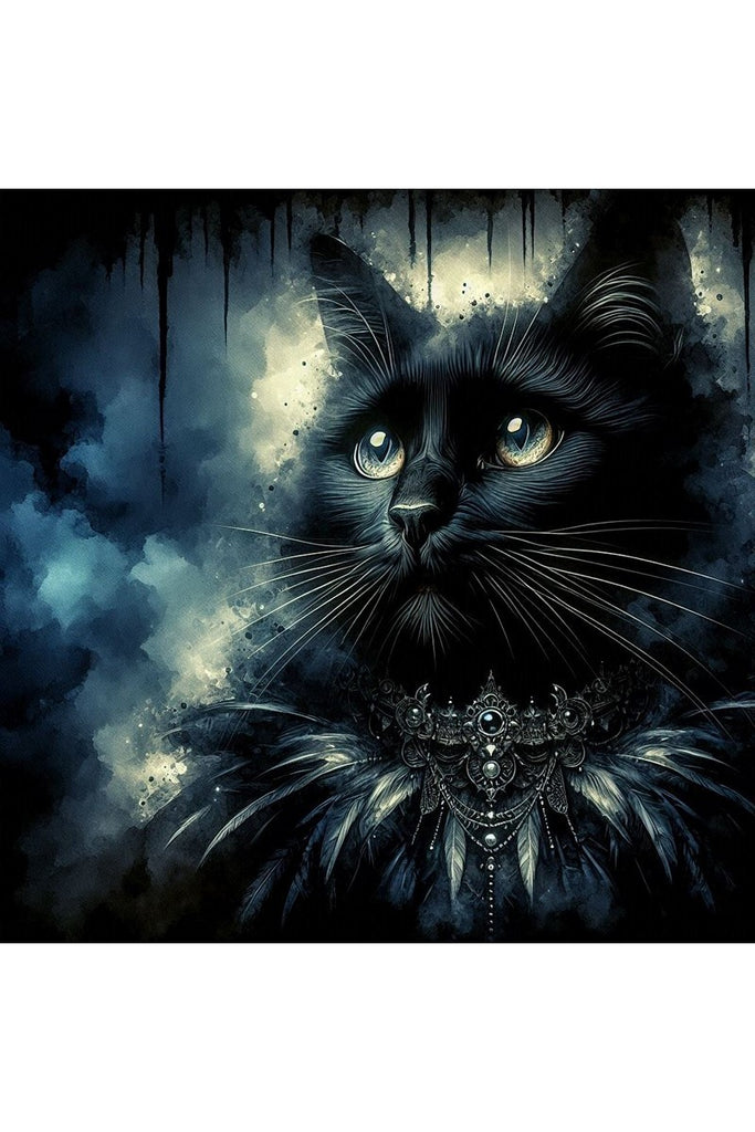 This dramatic print captures the essence of a truly majestic feline. With its rich black coat and piercing, glowing yellow eyes, this long-haired cat is more than a portrait; it is a symbol of quiet authority. Adorned with a regal necklace of dark jewels and feathers, the cat has the presence of a powerful guardian or a mystical ruler. The background, a swirling mix of inky blues and grays, adds to the mysterious atmosphere, making the feline stand out as a beacon of grace in the darkness. This piece is perfect for those who appreciate art that tells a story of power, elegance, and enchantment.