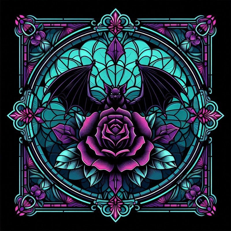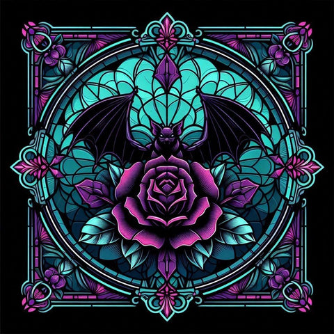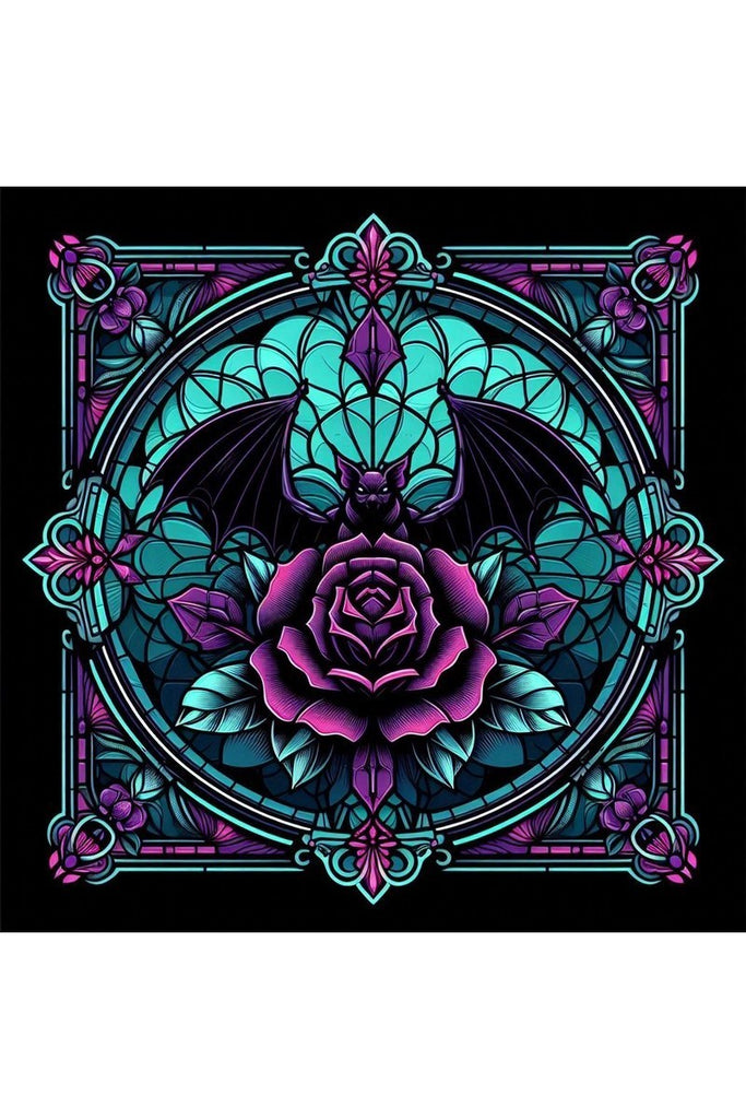 This square art print is a striking, modern take on the stained glass style. The Midnight Rose Print features a powerful central image of a bat and a rose, defined by a bold and vibrant color palette of magentas, purples, and teals.