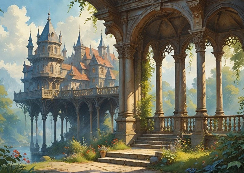 The print features a magnificent, fantastical castle, an architectural marvel built upon an expansive lake. Its multiple spires and elaborate structure are supported by a complex network of wooden and stone pillars, showcasing a unique blend of Victorian and medieval design. This masterful creation is more than a building; it's a testament to imaginative design and a centerpiece of a magical landscape.
