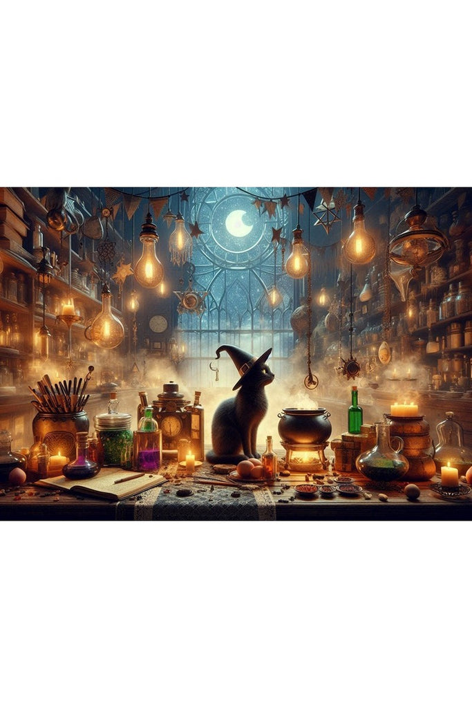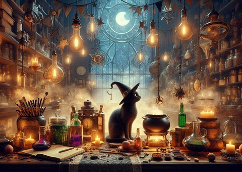 Step into a world of cozy magic with The Witch's Kitchen Print. This whimsical digital illustration features a cluttered, atmospheric room filled with all the tools of a spellcaster. At its centre, a black cat, wearing a small, pointed witch hat, sits on a wooden workbench, a perfect familiar for a world of potions and arcane instruments.