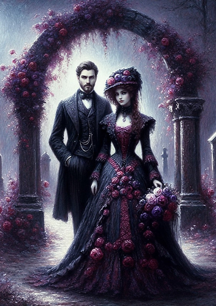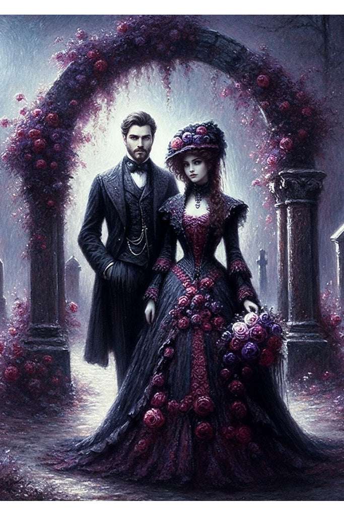Step into a world of Victorian gothic romance with the Oakhart Industries Under the Rose Arch Print. This exquisite artwork captures a poignant moment between a man and a woman in ornate, dark Victorian attire, standing within a mysterious cemetery. A stunning archway, heavy with deep red and purple roses, frames the couple, their elegance contrasting with the sombre yet romantic setting.