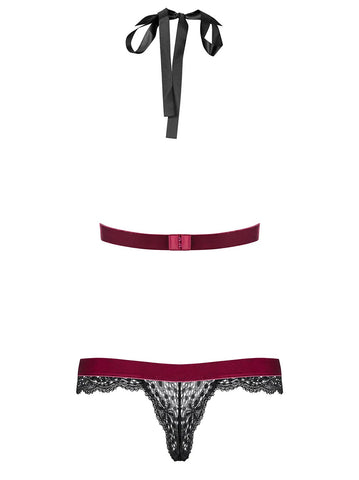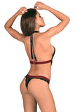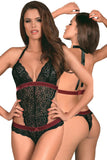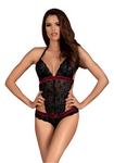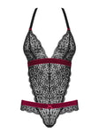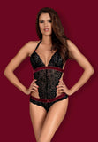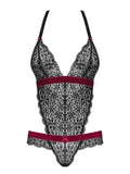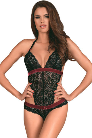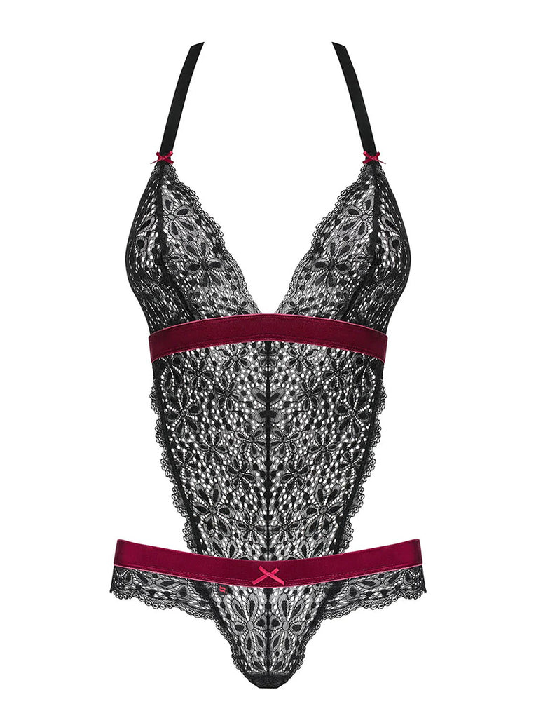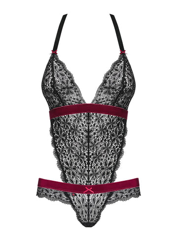 • An Amazing, Elegant Design: This body is crafted entirely from soft, stretchy black lace, providing a luxurious feel and intricate look. A velvety, burgundy-colored strip underneath the breasts and a matching waistband on the panty part add a touch of color and sophisticated contrast.