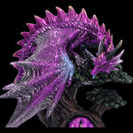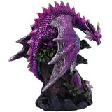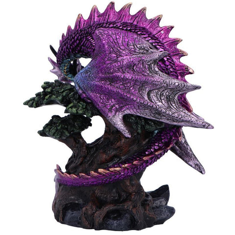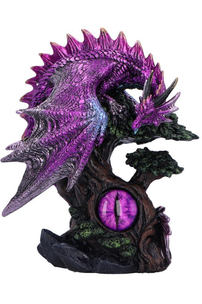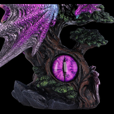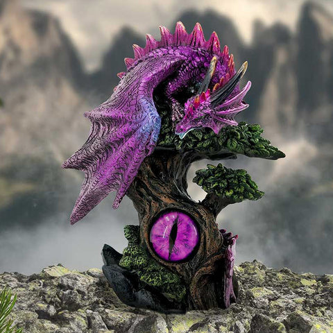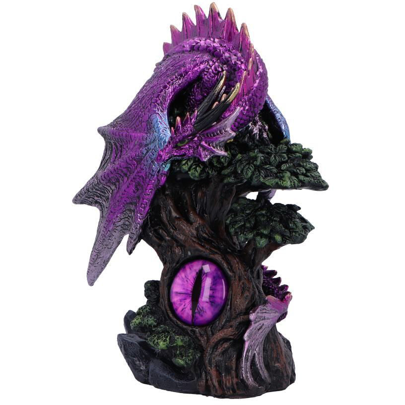 Immerse yourself in the enchanting world of our Draconic Seer figurine. This captivating piece features a majestic, glimmering purple adult dragon adorned with stunning blue highlights. The dragon is gracefully perched atop a large tree, its roots intricately wrapping around a substantial rock at the base. At the core of the tree, a mesmerizing purple eye with a feline-like pupil, adds an aura of mystery and magic to the scene. Crafted from the finest resin and meticulously hand-painted, this figurine stands 17cm tall, making it a unique and eye-catching addition to any collection. Explore our diverse range of dragon-themed giftware, tailored for those who have a deep appreciation for magical creatures and medieval mythos.