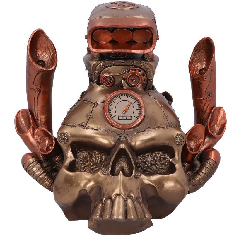 This motor skull is cast in high-quality resin before being carefully hand-painted. A vintage bronzed hot rod engine cracks through the riveted skull while a gauge sits centrally on the forehead. Large pipes emerge from the curved cheekbones of this unusual cranium, perfect for any motor loving petrolhead!