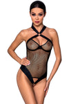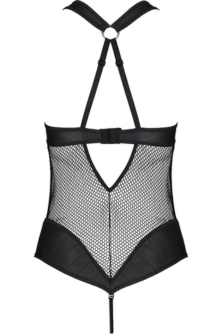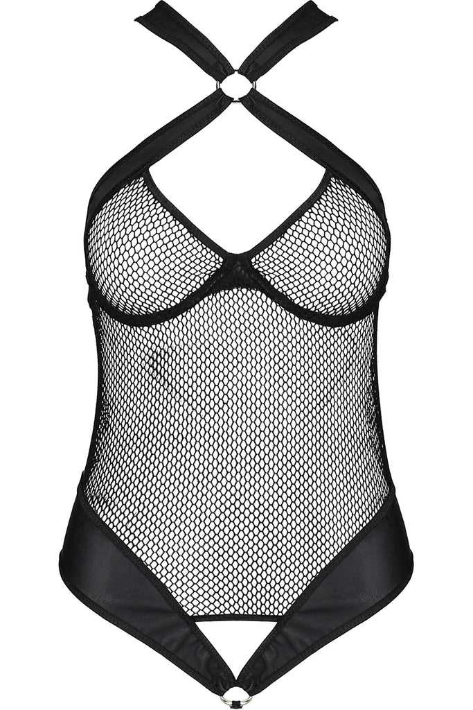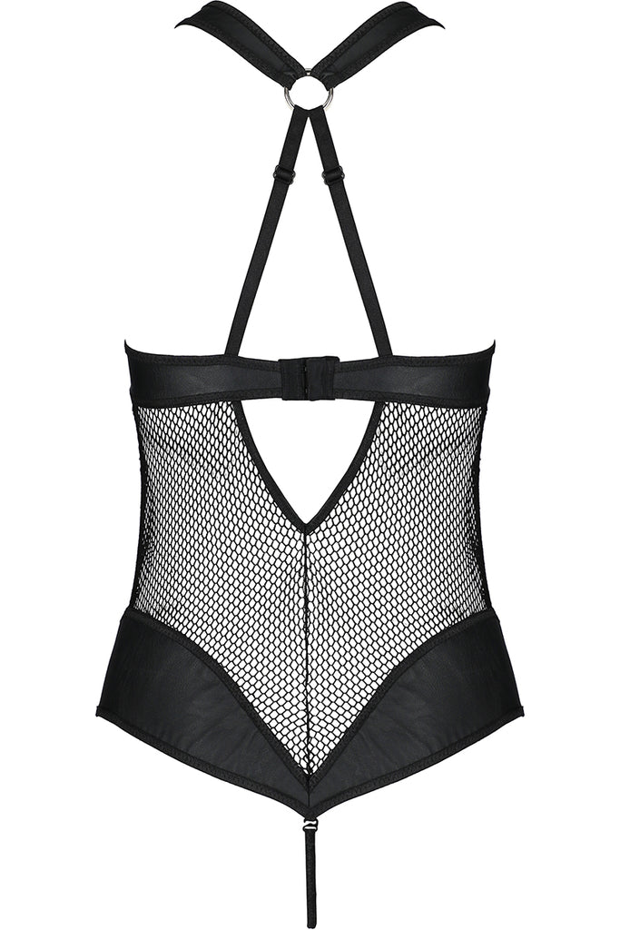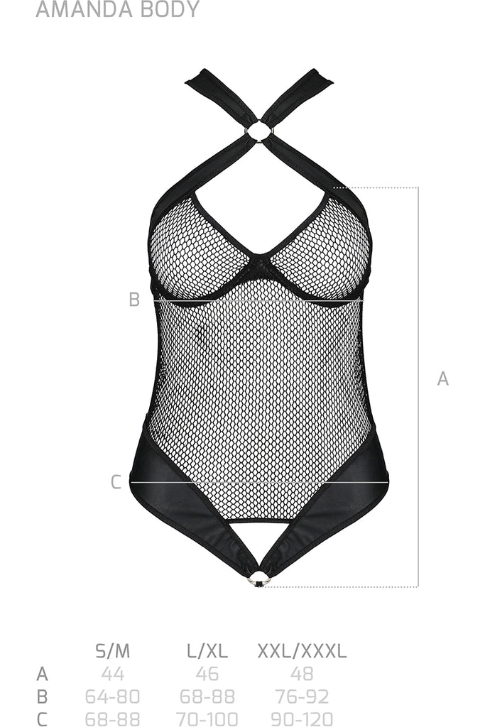 Amanda body is a sensual combination of leather with mesh that emphasizes the bust in a seductive way and subtly reveals the body, and the gold-plated joints in the form of circles give it a claw.