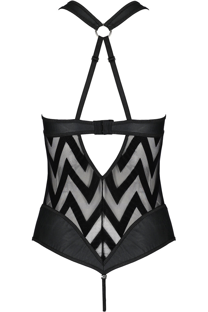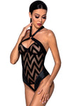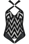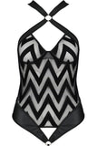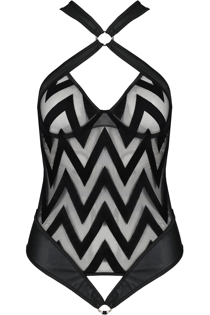 Discover the irresistible allure of the Passion Lingerie Hima Body. This captivating one-piece is a masterpiece of design, combining the luxurious textures of flock and leather with the modern elegance of circular accents.