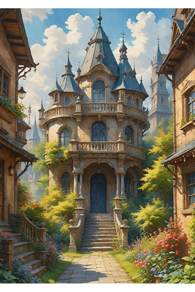 Step into a storybook world with our "The Whispering Turret" framed print, a truly enchanting piece that brings a sense of whimsy and peace to any space. This art captures a unique, fantastical building with a grand, curving staircase and multiple spires, creating a captivating focal point. The meticulous detail in the architecture, combined with the vibrant garden filled with blooming red and pink flowers, creating a magical, inviting scene.