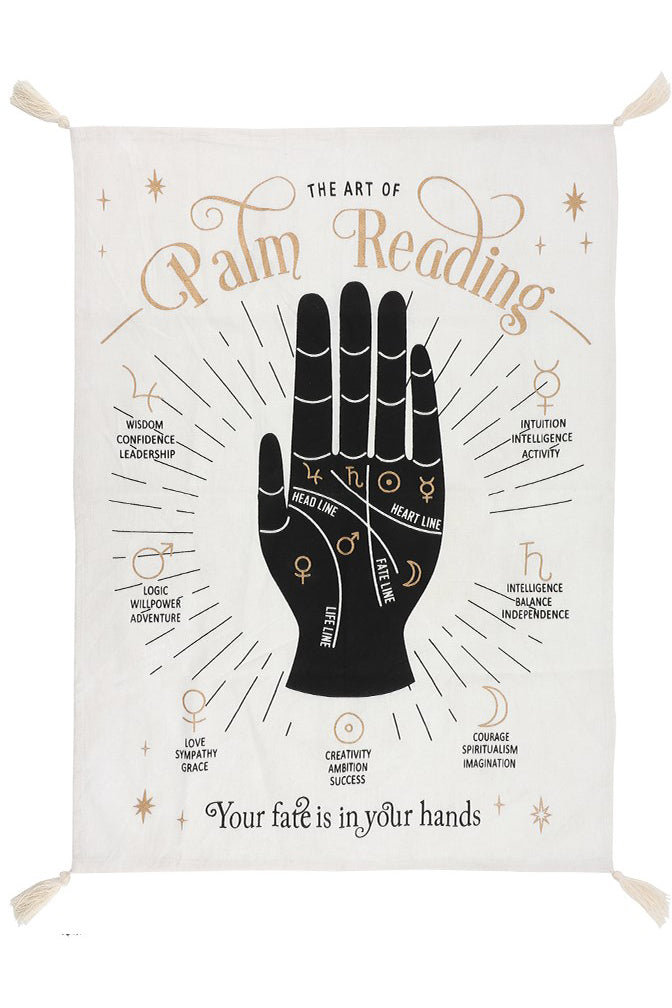 This wall tapestry with mystical palm reading design and corner tassels is sure to make an impact. Gold printed accents add extra magic to this stunning design. This tapestry can be used for a wide range of purposes including as a table cloth, sofa throw, floor covering and more.