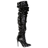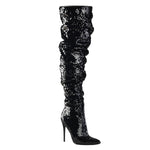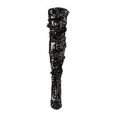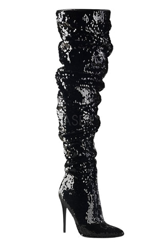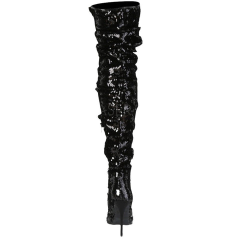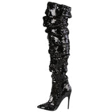 Embrace the glamour and command attention with the Pleaser COURTLY-3011 Black Sequin Boots! These dazzling over-the-knee boots feature a captivating ruched sequin design that shimmers and shines with every step, making you the center of attention wherever you go.
