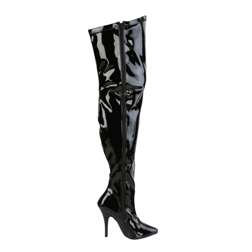 Indulge your deepest desires with the Pleaser Pink Label SEDUCE-3000WC boots. These thigh-high marvels blend luxurious stretch with a captivating patent sheen, creating a silhouette that's both comfortable and undeniably alluring.