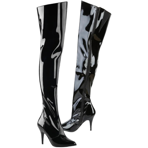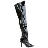 The Pleaser VANITY-3010 boots are a symphony of sophistication and allure. These thigh-high beauties boast a sleek black patent PVC upper, a flattering 4-inch heel, and an elasticated gusset for a perfect fit. Designed to elevate any outfit, these boots exude timeless elegance with a modern twist.