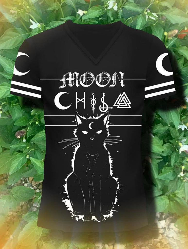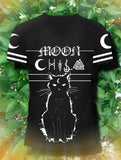 - Mystical Design: Crescent moon and cat print with celestial symbols.