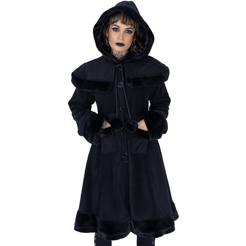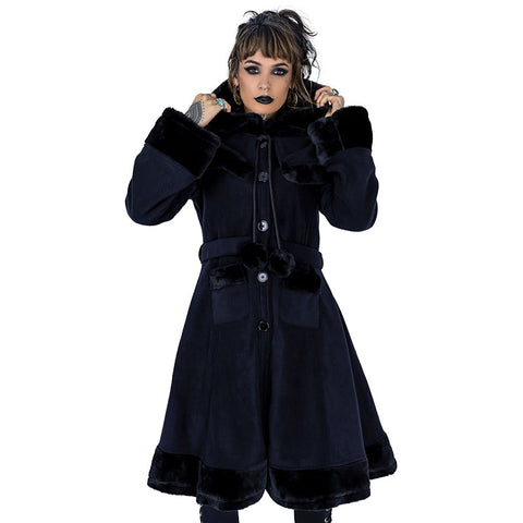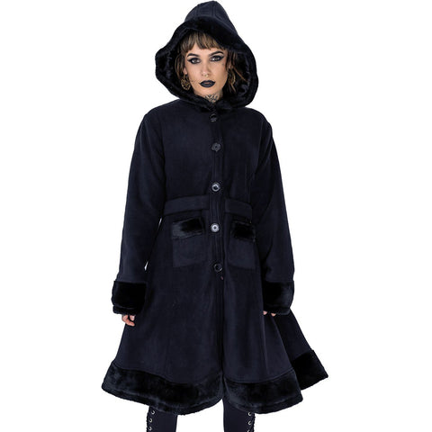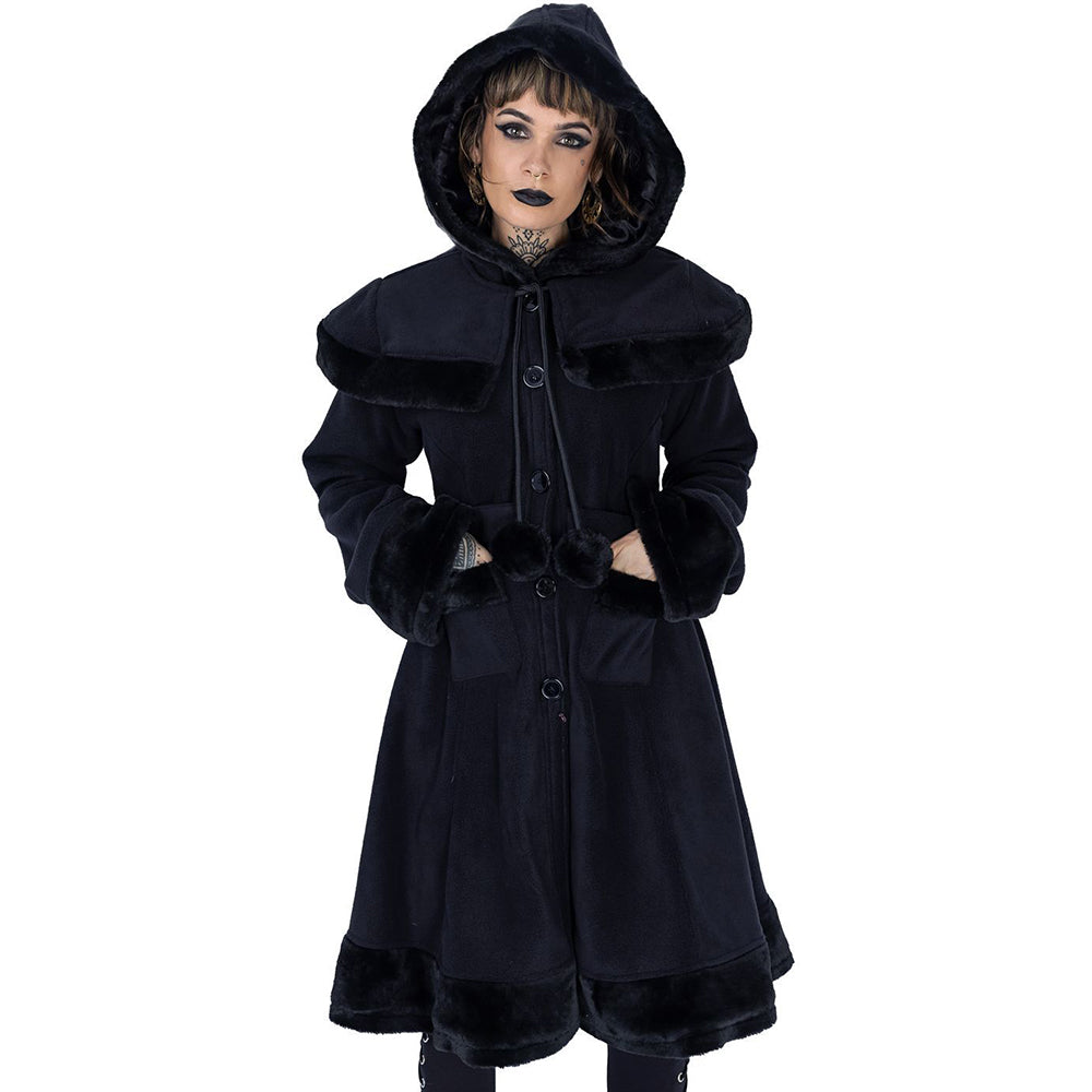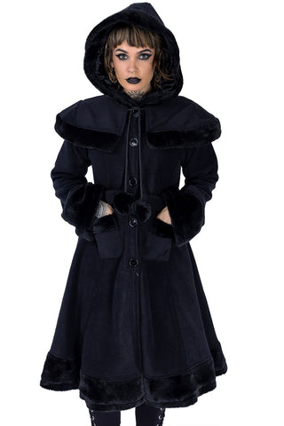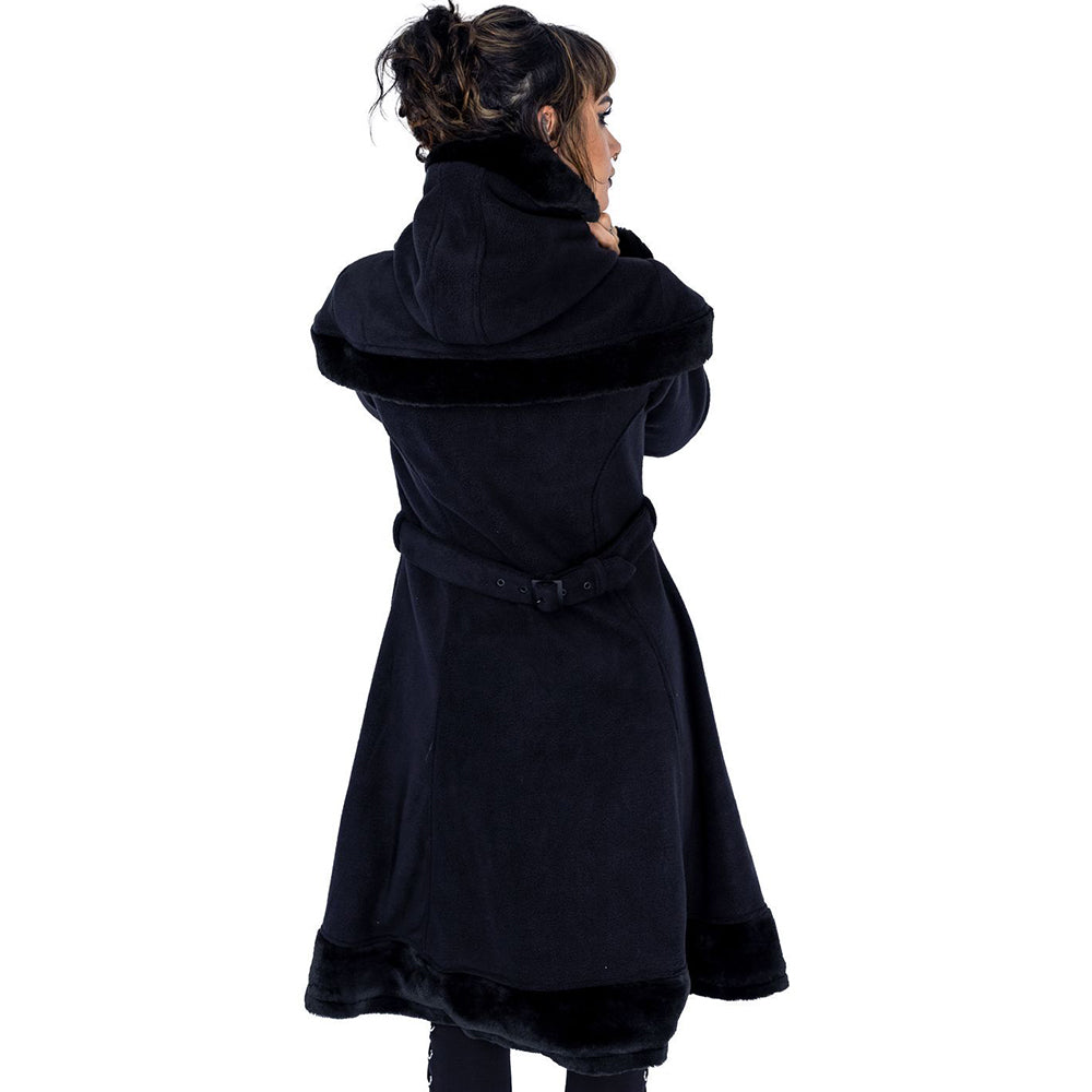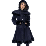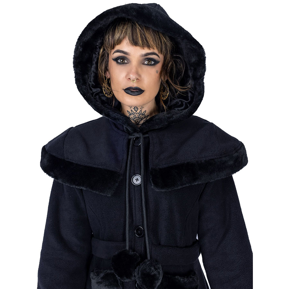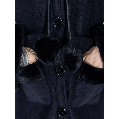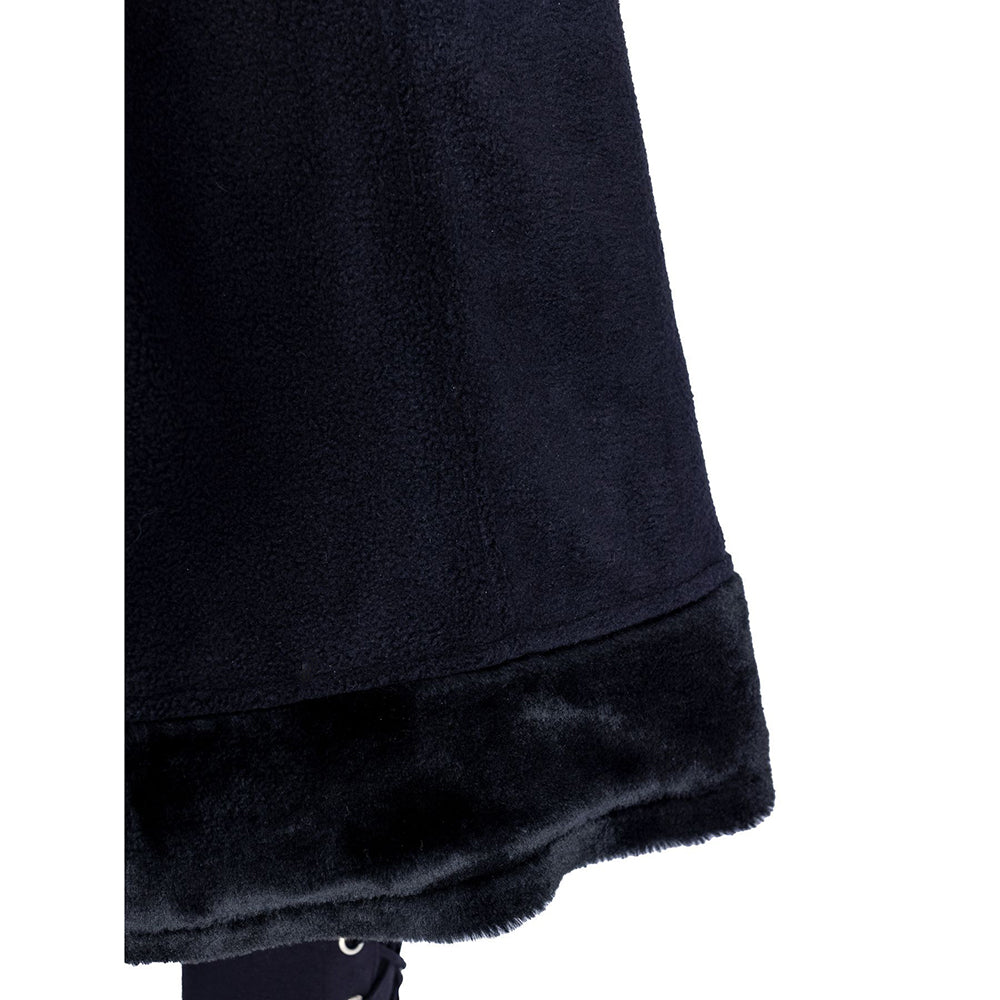Black fleece 3/4 length coat with faux fur trim to the hood, sleeve cuffs, pocket edges and detatchable shoulder cape. Coat fastens at the front with buttons.
