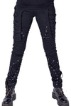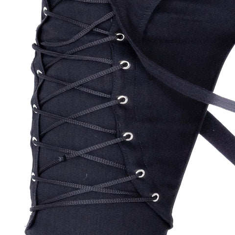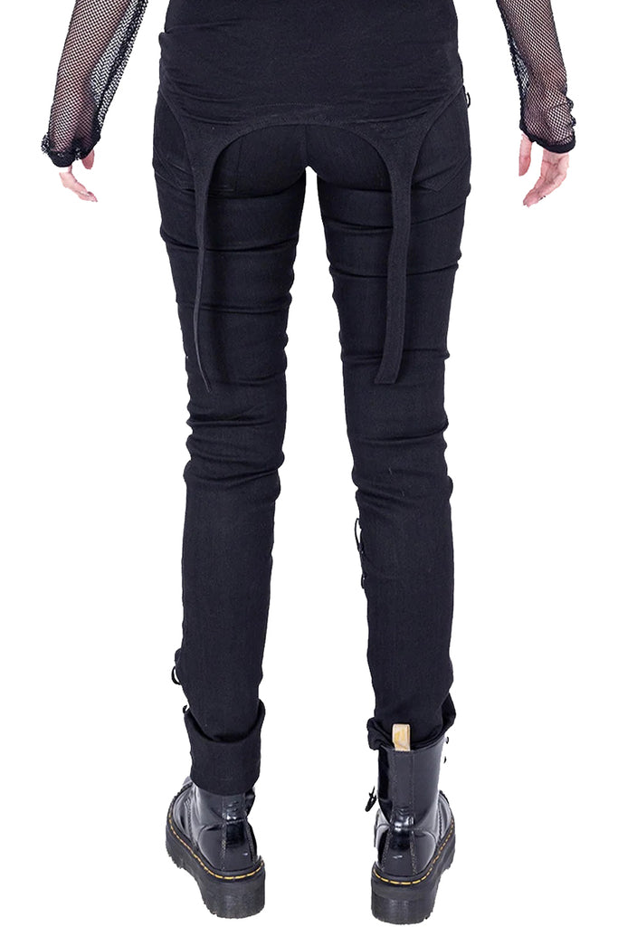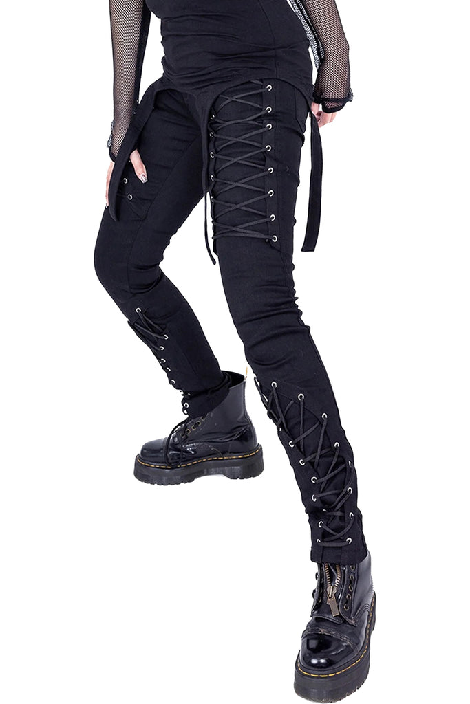 Black laced ladies trousers from Vixxsin. These great alternative black stretch jeans feature curved corset style lacing panels on the outside of the thighs and on the lower leg. The trousers have jeans style pockets at the front and back and fasten with a zip fly and button at the waist. Please note: the dangling straps in the photos are part of the model's top, not the trousers.