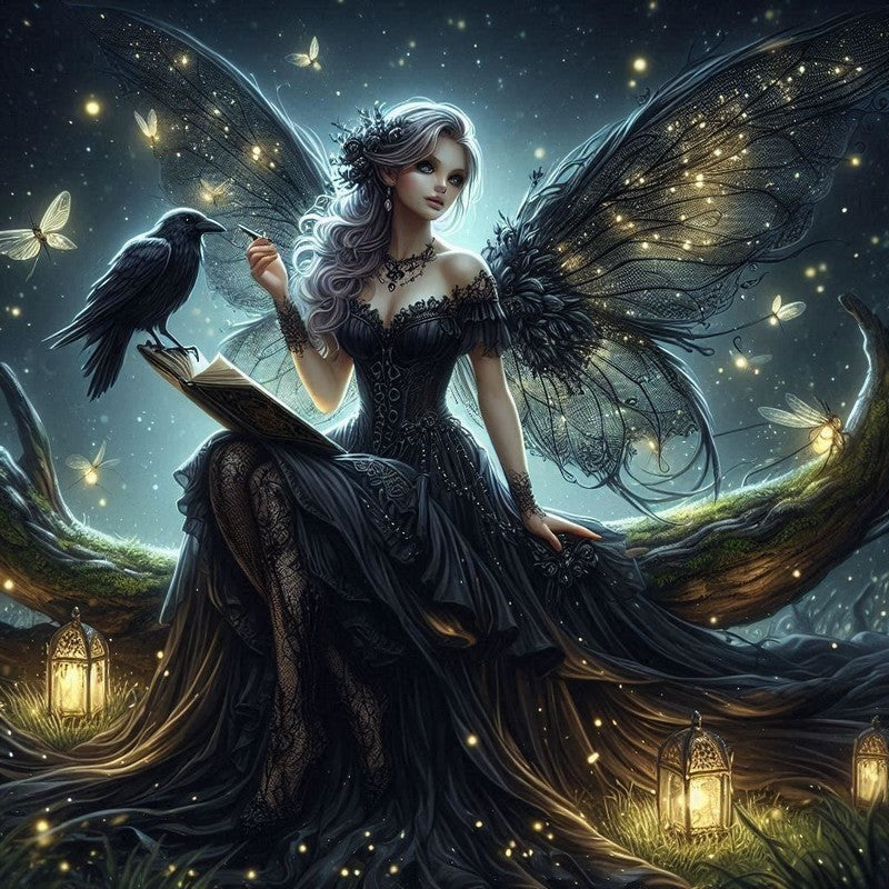 This art print captures a beautiful fantasy fairy figure with large, luminous wings. The Raven's Tale Print features a figure with pale skin and long, flowing silver hair, dressed in an intricate black gown with a corset-like bodice and a flowing skirt, paired with lacy black stockings. Her wings are dark and delicate, with a pattern of glowing golden lights.